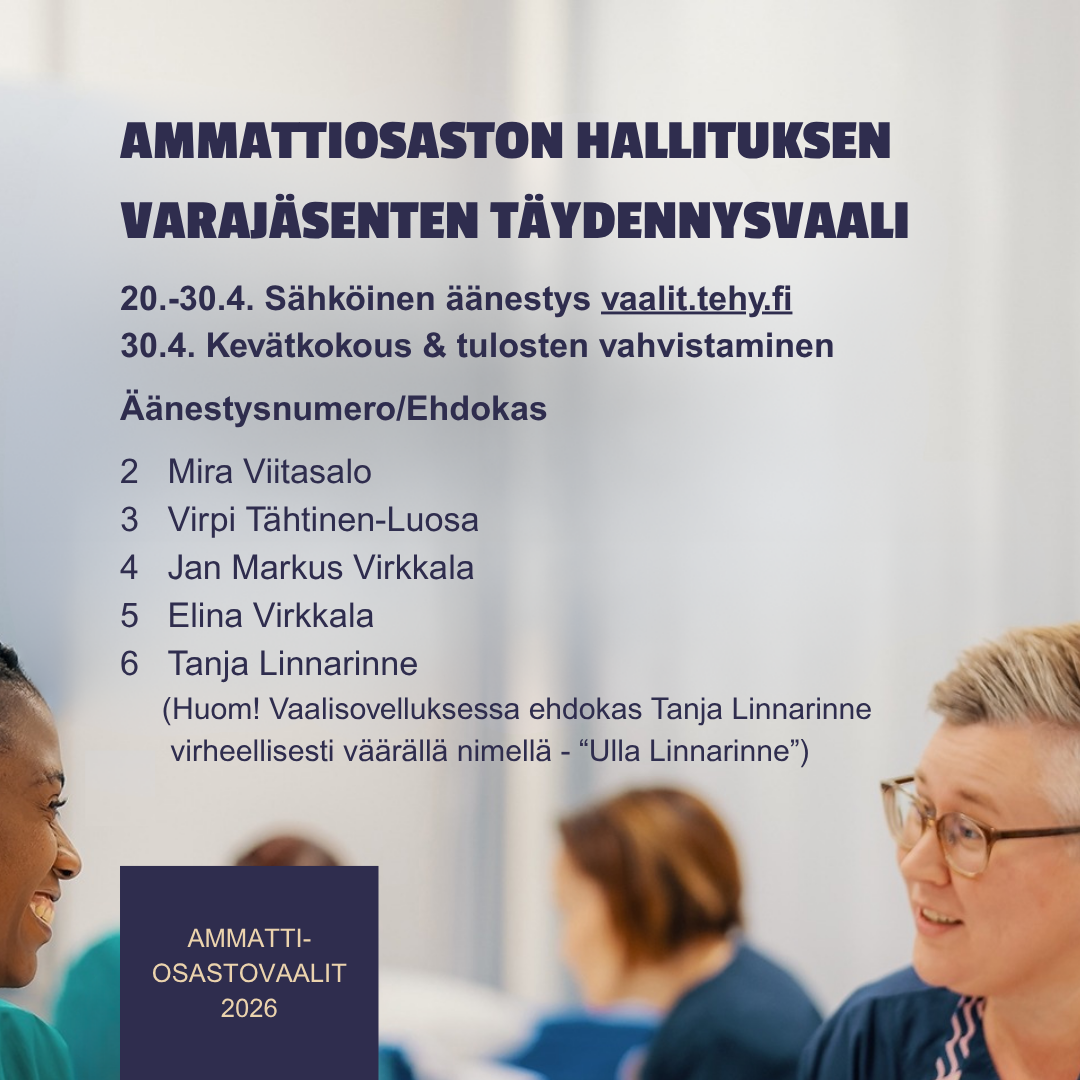 Tältä sivulta löydät Tehyn Soiten ao650 hallituksen varajäsenten täydennysvaalien vaalilautakunnan hyväksymät ehdokkaat.